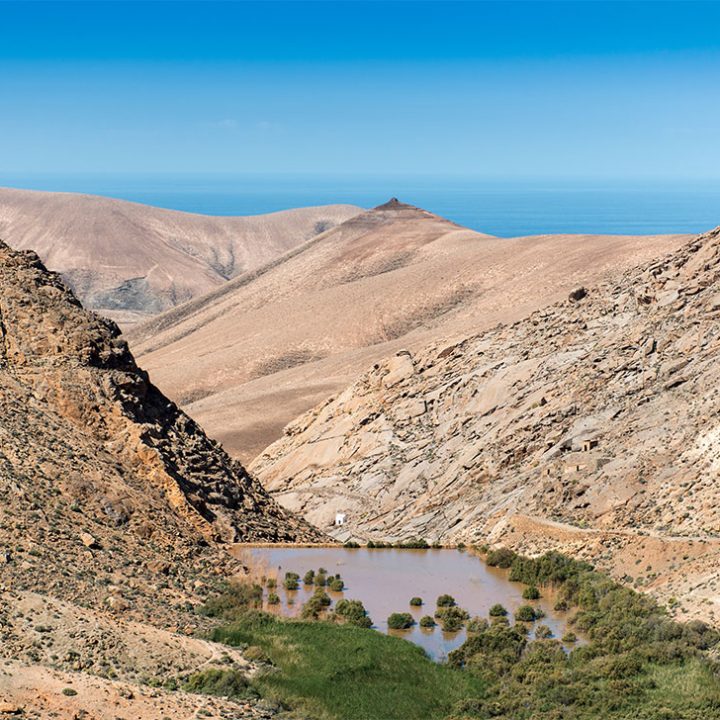Para sorpresa de muchos, la también llamada “isla playa” esconde en su interior un mundo que nadie imagina pudiese existir en este paisaje aparentemente llano. Poblados marineros como El Jablito o El Cotillo, o el pueblo de Betancuria (antigua capital de la isla), harán las delicias de todos aquellos que quieran conocer la isla a fondo y descubrir rincones pintorescos. Precisamente en el espacio natural de Betancuria encontrarás el barranco de las Peñitas, uno de los lugares más interesantes de la isla. El barranco es parte de uno de los senderos más bonitos de Fuerteventura, recorriendo las localidades de la Vega de Río Palmas y Buen Paso, y desembocando en la espectacular Ajuy con sus afamadas cuevas, donde piratas y corsarios comerciaban. Además de poseer un paisaje insólito, el barranco de las Peñitas lleva en su regazo la presa y delgadas palmeras que crean este refugio verde en medio del desierto. Y en este mismo barranco se alza la preciosa ermita de la Virgen de la Peña, patrona de Fuerteventura que regala el nombre a este lugar. Sin duda alguna, este camino se ha convertido en un lugar de culto para senderistas y escaladores. Las formaciones rocosas de sienita que son fruto del magma basáltico y parecen islotes enclavados en medio de la tierra, crean el escenario perfecto para la escalada en bloque.